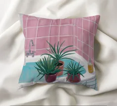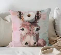 Un'illustrazione umoristica per il bagno degli ospiti: "Siediti, non fare pipì in piedi!". - in colori pastello e design minimalista delle piastrelle, perfetto per un bagno moderno.