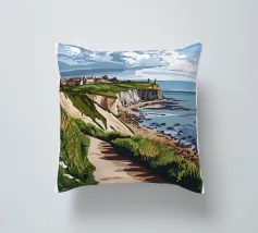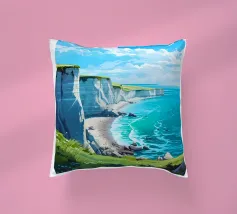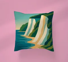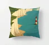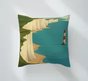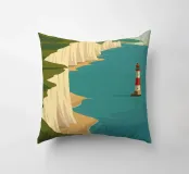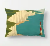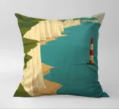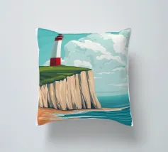 Design di viaggio minimalista dell'Inghilterra meridionale con le famose scogliere bianche (chalk cliffs) e il faro sulla costa inglese vicino a Dover. Tipico paesaggio di scogliere chiare.