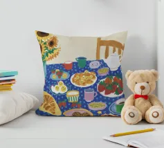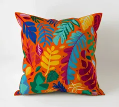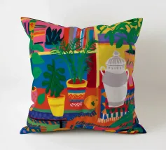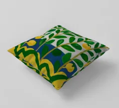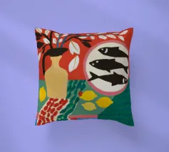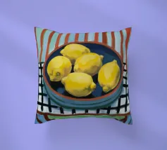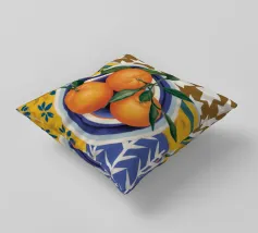 Un vivace bouquet di fiori e agrumi si trova in un vaso blu su un tavolo rosa. Lo sfondo è un mix dinamico di motivi a zig zag in bianco e nero e foglie verdi, che creano una natura morta moderna e giocosa.
