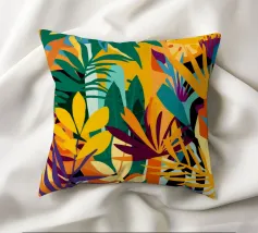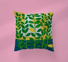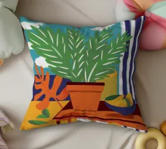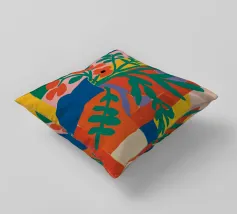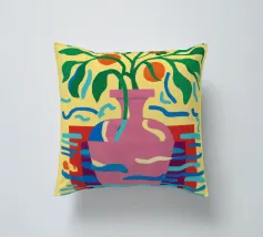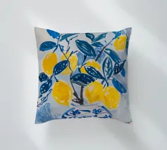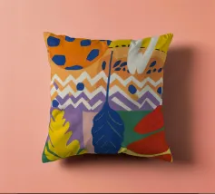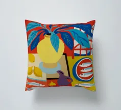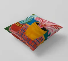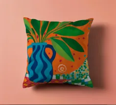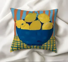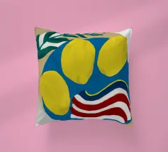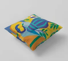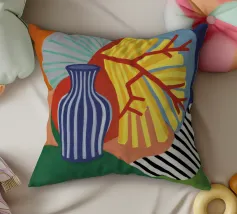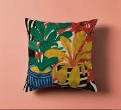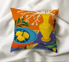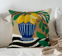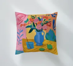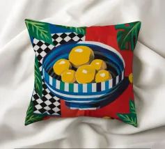 Un vivace bouquet di fiori e agrumi si trova in un vaso blu su un tavolo rosa. Lo sfondo è un mix dinamico di motivi a zig zag in bianco e nero e foglie verdi, che creano una natura morta moderna e giocosa.