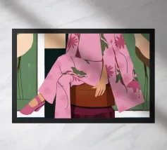 Questa opera d'arte raffigura una persona sdraiata su una sedia, che indossa un abito con un motivo a foglie. Lo sfondo include vari elementi stravaganti come un gatto e forme astratte, creando una scena giocosa e rilassata.