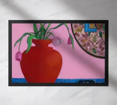 La geometria spoglia di una passerella coperta è definita da audaci pilastri cremisi e dalle ombre lunghe e nette che proiettano nella luce del sole. Questo dipinto è un potente studio di luce, ombra, colore e forma architettonica.