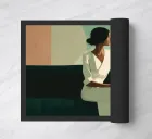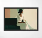 Blending mid-century tones and modern grace, this piece explores the intersection of shape and solitude. The soft color palette and bold geometry echo the woman’s tranquil presence, crafting a composition that feels like visual jazz—sophisticated and effortless.