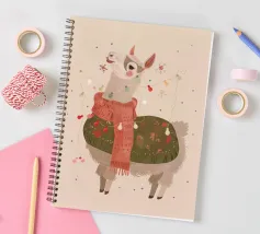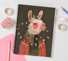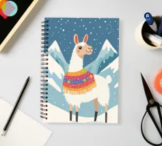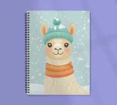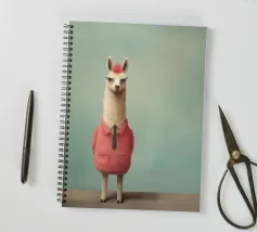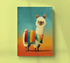 Un lama bianco con orecchie e naso neri indossa una sciarpa a righe colorate in rosso, arancione, giallo e turchese. Con un leggero sorriso e gli occhi chiusi, si trova su un fondo arancione strutturato davanti a uno sfondo giallo-turchese diviso - affascinante e giocoso.