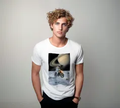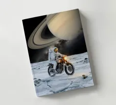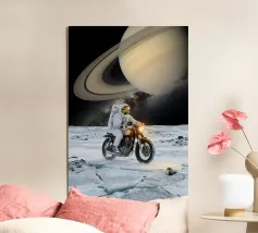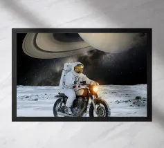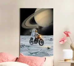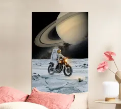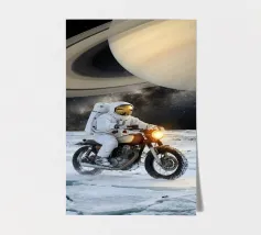 Questa surreale opera d'arte spaziale raffigura un astronauta in sella a una moto d'epoca che attraversa un paesaggio extraterrestre ghiacciato, con gli enormi anelli di Saturno che si stagliano drammaticamente nel cielo. La scena, che unisce l'avventura fantascientifica a fantasiosi elementi di paesaggio onirico, evoca l'esplorazione, la libertà e la meraviglia cosmica. Perfetta per gli appassionati di spazio, gli amanti delle moto e i fan dell'arte murale audace e futuristica. Una stampa di grande impatto che aggiunge emozione e creatività a qualsiasi casa, studio o ufficio moderno.