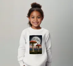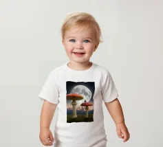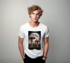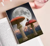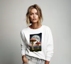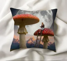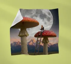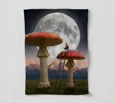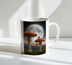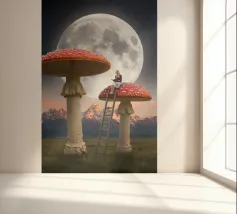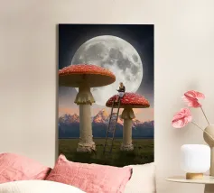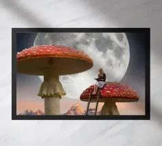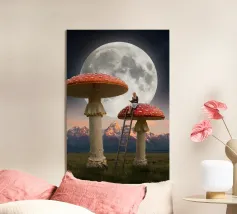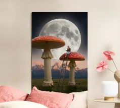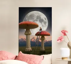 Fuggite in un magico paesaggio da sogno con questa surreale opera d'arte fantasy che raffigura una donna che legge pacificamente in cima a imponenti funghi rossi sotto una luna piena splendente. La scena, ambientata tra maestose montagne e un cielo stellato, fonde natura, immaginazione e tranquilla meraviglia in un momento fiabesco. I funghi e la scala sovradimensionati evocano curiosità e sogni d'infanzia, mentre l'atmosfera lunare aggiunge calma e mistero. Perfetta per camere da letto, spazi creativi e interni moderni, quest'opera d'arte piace agli amanti del surrealismo, dell'arte fantastica e della narrazione stravagante.