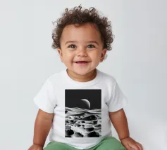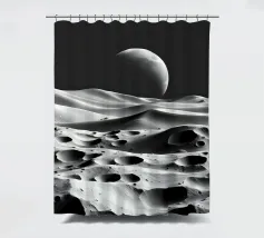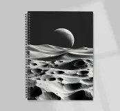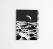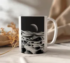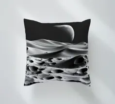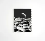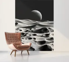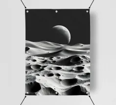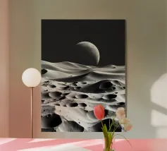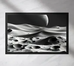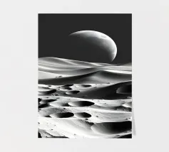 Intraprendete un viaggio ultraterreno con questa stampa d'arte drammatica e altamente dettagliata, che cattura uno splendido paesaggio lunare monocromatico. L'opera presenta una scena desolata ma bellissima di un terreno pieno di crateri che lascia il posto ad ampie colline simili a dune, il tutto reso in suggestive tonalità di nero, bianco e grigio. Un'enorme luna crescente si staglia nel cielo scuro, proiettando sulla scena un bagliore oscuro e ultraterreno. Quest'opera d'arte combina magistralmente la texture di una superficie craterizzata con le curve eleganti di un deserto alieno, creando un potente senso di profondità e scala. Perfetto per un ambiente moderno o industriale.
