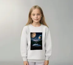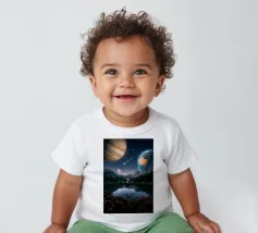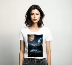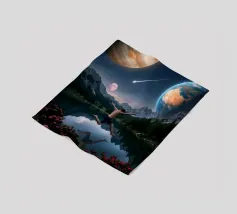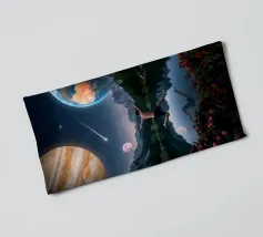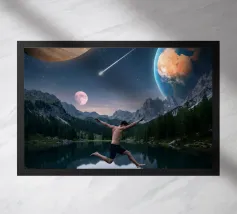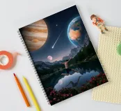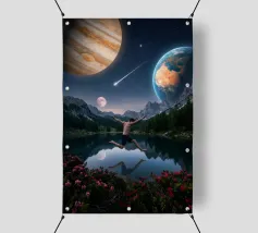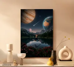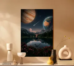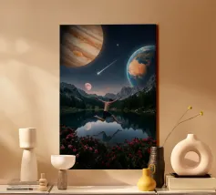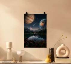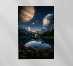 Una potente fusione di natura e universo, Leap Into the Cosmos cattura una figura umana sospesa a mezz'aria sopra un lago di montagna cristallino, che riflette un cielo pieno di Giove, della Terra, di una luna incandescente e di una meteora che si muove. Le lussureggianti foreste alpine e i vivaci fiori selvatici fondano la scena in una bellezza naturale, mentre il cielo cosmico espande l'immaginazione oltre ogni limite. Questa surreale opera d'arte spaziale simboleggia la libertà, il coraggio e il salto tra la realtà e l'ignoto. Perfetto per gli amanti dell'arte cosmica, dei paesaggi fantastici e dell'arte murale moderna e surreale, questo disegno conferisce energia e profondità.