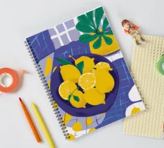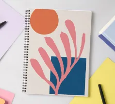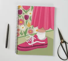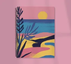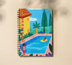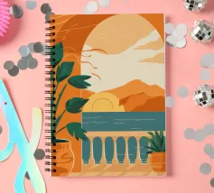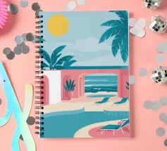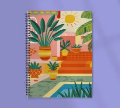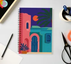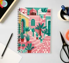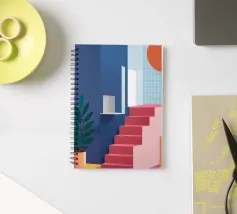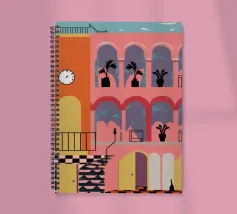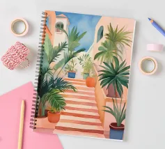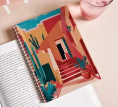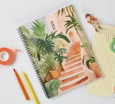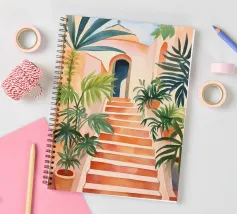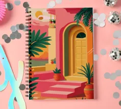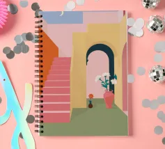Scale rosse e vivaci conducono attraverso un edificio colorato e semplificato verso un lussureggiante ingresso ad arco, suggerendo un viaggio verso una destinazione bella ed esotica.