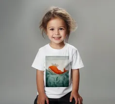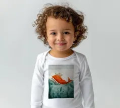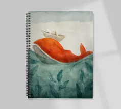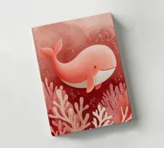 Una stravagante illustrazione ad acquerello che raffigura una serena balena rossa che scivola tra le onde dell'oceano, trasportando una delicata barchetta di carta sul dorso. Le texture morbide e le tonalità sognanti creano una scena tranquilla e poetica, evocando un senso di meraviglia, immaginazione e pacifica avventura sotto il cielo aperto.