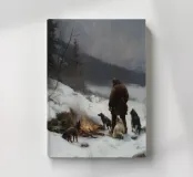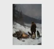 Un suggestivo motivo invernale: un cacciatore si trova con i suoi cani accanto a un falò riscaldante nel mezzo di un paesaggio montano innevato. L'immagine trasmette un senso di avventura, vicinanza alla natura e la tranquilla bellezza dell'inverno. I caldi accenti di luce del fuoco contrastano con il fresco paesaggio innevato e creano un'atmosfera suggestiva. Ideale per murales, tazze, cuscini o tessuti: un disegno unico per tutti coloro che amano l'aria aperta, la caccia, la natura e il romanticismo dell'inverno.