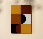 Questo pezzo di ispirazione Bauhaus unisce le calde tonalità del marrone e del senape con audaci forme geometriche per un'accogliente atmosfera da metà del secolo scorso. Perfetto per aggiungere un tocco di fascino retrò e di equilibrio moderno a qualsiasi spazio.