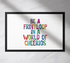 Celebrate l'individualità con la nostra vivace stampa tipografica "Be a Fruitloop in a World of Cheerios". Questo messaggio giocoso prende vita con una splendida scritta dipinta a mano in acquerello arcobaleno, che contrasta splendidamente con uno sfondo bianco. Perfetto per le camere dei bambini, le camerette o qualsiasi altro spazio che necessiti di un tocco di colore e positività, questo allegro disegno incoraggia ad abbracciare l'unicità. Lo stile artistico e stravagante si rivolge sia ai bambini che agli adulti, rendendolo un'aggiunta versatile a qualsiasi casa. Lasciate che questa stampa ispiratrice illumini il vostro spazio e ispiri fiducia!