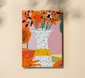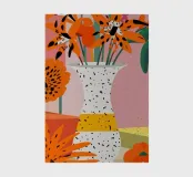 Un'esuberante natura morta di un bouquet di fiori arancioni e foglie verdi in un vaso bianco dalla fantasia unica. L'opera è piena di vita, di energia e del calore gioioso della sua tavolozza di colori.