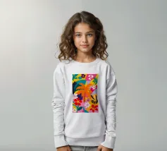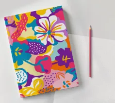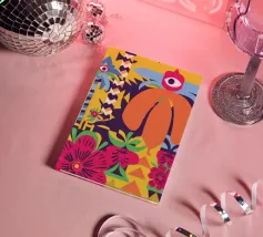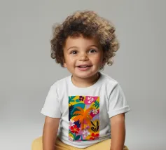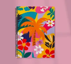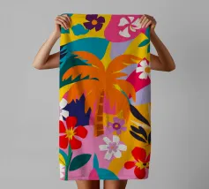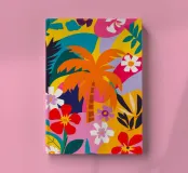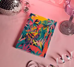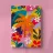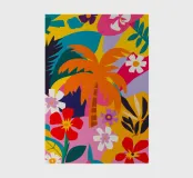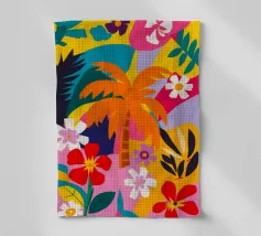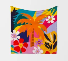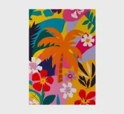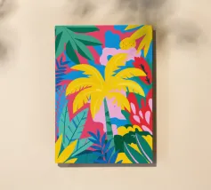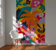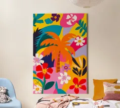 Una scena intensamente vibrante e ricca di fiori tropicali e foglie di palma in un tripudio di colori. Rosa caldo, giallo brillante, arancione e blu intenso creano un'atmosfera festosa ed energica, che celebra l'abbondanza di un paradiso tropicale.
