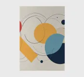L'opera d'arte presenta una disposizione dinamica di forme geometriche dai colori vivaci. Cerchi, rettangoli e linee si intrecciano, creando un senso di movimento ed equilibrio.