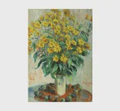 I fiori di carciofo di Claude Monet (1880) è una radiosa natura morta impressionista, ricca di fiori giallo-oro. Dipinta con pennellate energiche e sciolte, la tela cattura la vivacità e il calore della luce solare di fine estate. Monet trasforma l'umile fiore del topinambur in un soggetto elegante e vitale, enfatizzando il movimento, il colore e la bellezza fugace della natura. Questa natura morta floreale anticipa la devozione di tutta la vita di Monet per i giardini e le fioriture, riflettendo la sua capacità di elevare fiori ordinari in opere d'arte senza tempo.