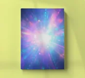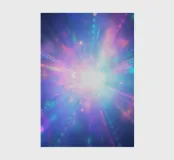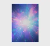 Raggianti fasci di luce si irradiano verso l'esterno in un'esplosione di colori, creando un'atmosfera cosmica dinamica e vibrante, piena di motivi vorticosi e di energia.
