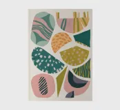 Una composizione astratta che assomiglia a un mosaico o a un collage, caratterizzata da varie forme organiche con diversi motivi e texture. La tavolozza di colori tenui e terrosi conferisce all'opera una qualità sofisticata e tattile.