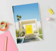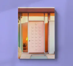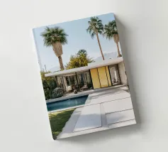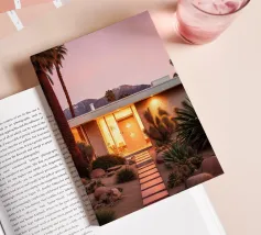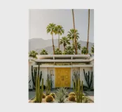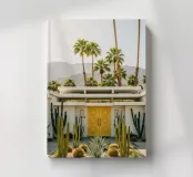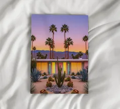 Portate il fascino di Palm Springs nella vostra casa con questa vivace stampa d'arte che raffigura una casa moderna di metà secolo incorniciata da cactus, palme e montagne.