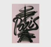 Questo poster moderno presenta la Torre Eiffel leggermente delineata dietro pennellate calligrafiche nere e dinamiche che scrivono "Paris" su uno sfondo rosa tenue.
