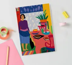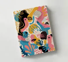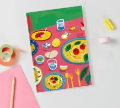 Una composizione astratta presenta una ciotola di fragole in mezzo a un turbinio di forme e motivi organici e colorati, creando un'interpretazione fresca e moderna di un classico dell'estate.