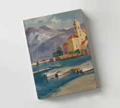 Un pittoresco paesaggio autunnale che raffigura un villaggio o una fattoria adagiata su una collina, circondata da un mosaico di alberi colorati nei toni dell'arancione e del giallo e da campi coltivati, con le lontane montagne blu a completare la scena.