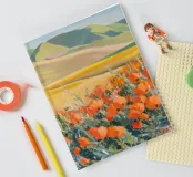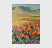Un campo di papaveri arancioni crea un brillante patchwork di colori su dolci colline verdi e dorate, rese in modo stilizzato e moderno che enfatizza la gioia del paesaggio.