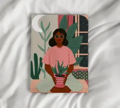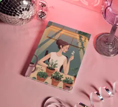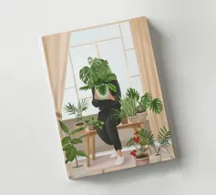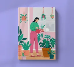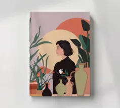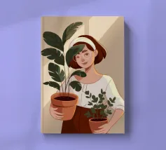 Una donna anziana cura le sue piante in una stanza dai toni tenui, esprimendo saggezza, calma e un legame senza tempo con la natura.