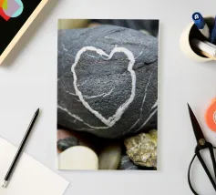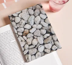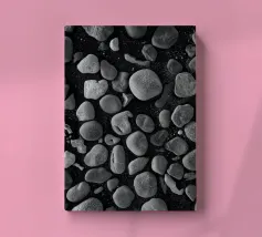 Rocce di varie forme e dimensioni sono adagiate su una spiaggia, con un'attenzione particolare a una pietra unica e strutturata. L'ambiente appare tranquillo, con la luce del crepuscolo che mette in risalto il paesaggio naturale.