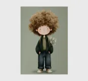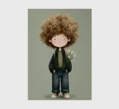 Illustrazione ad acquerello di un bambino con capelli ricci e castani, che tiene in mano dei fiori bianchi con un tenero sorriso. Un poster dolce e poetico, perfetto per decorare la parete della cameretta di un bambino.