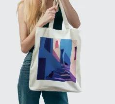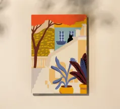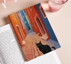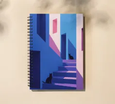 Un'illustrazione moderna e colorata con due gatti neri in un contesto architettonico di vicoli e scale dalle vibranti tonalità di blu e rosa. Il gioco di luci e ombre aggiunge un'atmosfera misteriosa e accattivante, ideale per evocare eleganza e intrigo in uno stile contemporaneo.