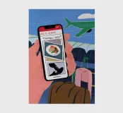 Un'illustrazione che mostra una mano che tiene in mano uno smartphone, scegliendo tra le destinazioni di volo online. L'immagine cattura l'eccitazione moderna e la possibilità di pianificare un viaggio in un mondo digitale.