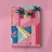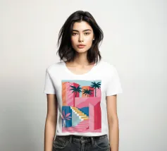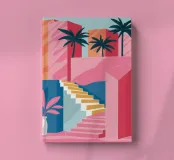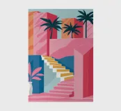Una scena architettonica minimalista e onirica con pareti rosa, una scala blu a chiocciola e piante tropicali. Le linee pulite e i colori pastello creano un'estetica serena e moderna.