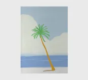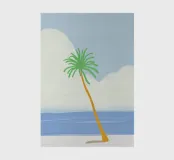 Una palma solitaria si affaccia su un mare azzurro e calmo, con soffici nuvole bianche che fluttuano nel cielo. La scena è pacifica e trasmette un senso di solitudine e semplicità tropicale.