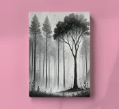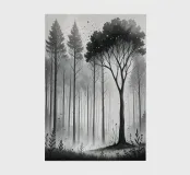 Portate la tranquillità in casa con questa stampa acquerellata monocromatica della foresta. Caratterizzata da fogliame a macchie d'inchiostro e alberi alti ed eleganti su uno sfondo nebbioso, quest'opera d'arte naturalistica astratta crea un'atmosfera calma e moderna.