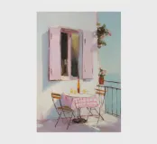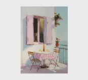 Il motivo raffigura un'affascinante scena di balcone mediterraneo in tenui colori pastello. Un tavolino con una tovaglia rosa, due sedie e una bottiglia invitano a soffermarsi al sole. Le pennellate morbide e la luce calda trasmettono una sensazione di estate, leggerezza e vacanze al mare.