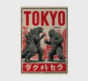 Una decostruzione ironica dei miti pop-culturali dell'orrore: nello stile di una linoleografia stampata a mano, l'opera combina l'estetica retrò dei vecchi manifesti giapponesi dei film di serie B e il fascino rustico della tradizione americana della xilografia. Godzilla e King Kong, i titani della distruzione, non sono qui in battaglia, ma in una posa assurda e amichevole, brindando con tazze rosse. La texture ruvida e le linee marcate danno energia all'immagine. Una dichiarazione audace e umoristica per i collezionisti che amano la forza grafica con un tocco di cultura pop.