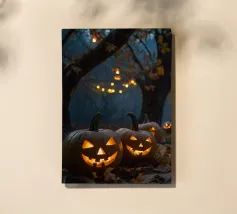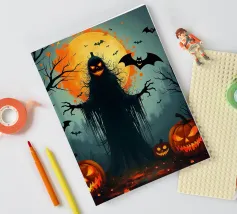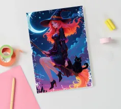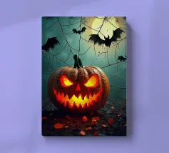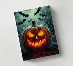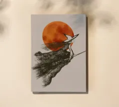 Al calare del crepuscolo, una strega in silhouette vola a cavallo della sua scopa tra i pipistrelli, con una zucca incandescente in primo piano, creando un'atmosfera incantevole.