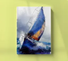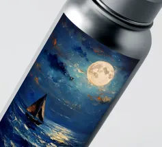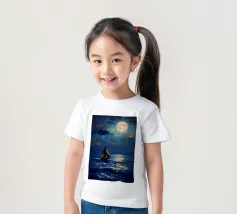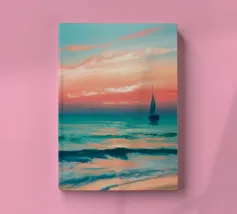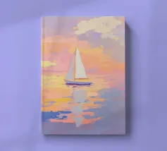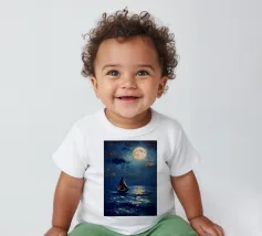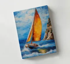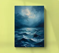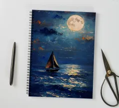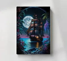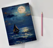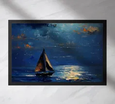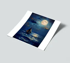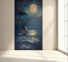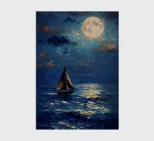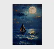 Immersa nel tenue ed etereo bagliore della luna piena, una barca a vela solitaria scivola pacificamente su un mare scuro e increspato. La luce lunare traccia un percorso scintillante sulla superficie dell'acqua, riflettendo l'orbe celeste come diamanti sparsi. Il cielo notturno è di un indaco intenso, punteggiato da stelle scintillanti e da ciuffi di nuvole che si tingono di arancione quando la luce della luna le cattura. Le vele della barca a vela sono delicatamente gonfiate da una brezza calma, che la porta avanti nella notte tranquilla. Quest'opera d'arte evoca un senso di serenità, solitudine e la tranquilla bellezza di un paesaggio marino notturno.