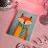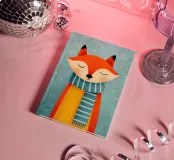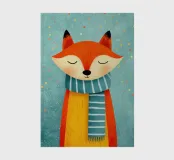 Una simpatica volpe rossa indossa una sciarpa a righe e sorride amichevolmente con gli occhi chiusi. L'illustrazione in stile libro per bambini combina un design piatto, colori pastello, un tema invernale ed effetti di coriandoli simili a puntini per creare un'atmosfera allegra e accogliente.