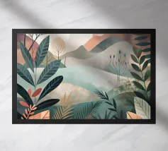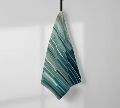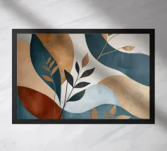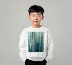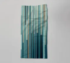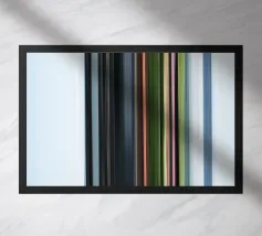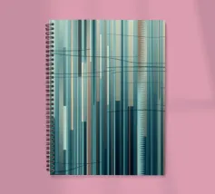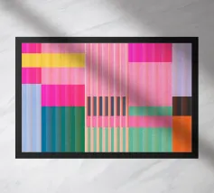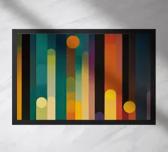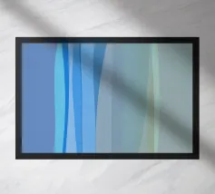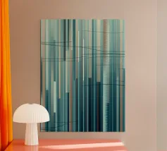 Una moderna stampa astratta di arte digitale con una composizione di linee verticali in una tavolozza di colori rilassanti di blu, verde acqua, marrone e beige tenui. Le linee variano in larghezza e tono, creando un senso di profondità e ritmo, mentre le linee orizzontali sottili e ampie aggiungono un contrasto dinamico. Questo pezzo evoca una sensazione di calma e raffinatezza, rendendolo un'aggiunta perfetta a spazi abitativi contemporanei, uffici o camere da letto.