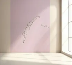 Una line art minimalista di un tuffatore in movimento, che cattura la grazia, la precisione e il movimento fluido. Perfetto per gli amanti dello sport e delle decorazioni a tema acquatico.