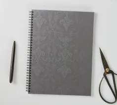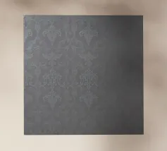 Questa ambientazione presenta un'elegante carta da parati con un dettagliato motivo floreale e damascato nei morbidi toni dell'argento e del grigio, perfetta per valorizzare l'arredamento di qualsiasi stanza.