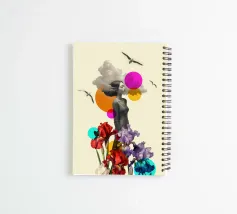 A surreal floral collage featuring a serene woman with her hair transforming into clouds, surrounded by graceful seagulls and bold irises. Vibrant geometric shapes contrast with monochrome elements, creating a dreamlike balance between nature, thought, and emotion. A striking piece for contemporary art lovers.