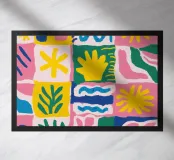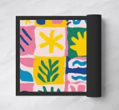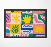 Una griglia gioiosa e colorata è riempita da una varietà di motivi e icone giocose, tra cui fiori stilizzati e forme astratte, che creano un design allegro e decorativo.