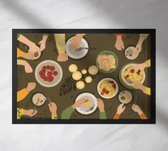 Una vista dall'alto di mani che condividono un grande piatto di spaghetti su una tovaglia a scacchi rossi e bianchi. La scena è una rappresentazione classica, gioiosa e un po' caotica di un pasto comune italiano.