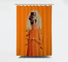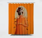 a woman wearing an orange dress with vintage camera as a head vibrant orange background with retro floral elements.