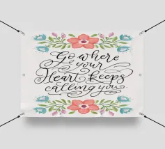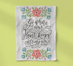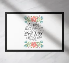 Fiori splendidamente disegnati a mano. Una grande frase al centro. Moderna calligrafia a pennello. Un motto di vita. Un motto con passione, calore e un atteggiamento positivo nei confronti della vita. Segui il richiamo del tuo cuore.