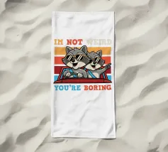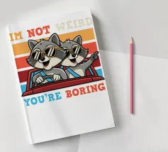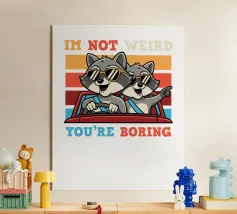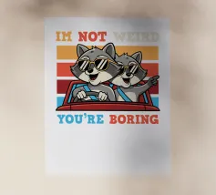 Due procioni con occhiali da sole viaggiano allegramente su un'auto rossa, con uno sfondo giocoso e colorato. La didascalia recita: "Io non sono strano, tu sei noioso".